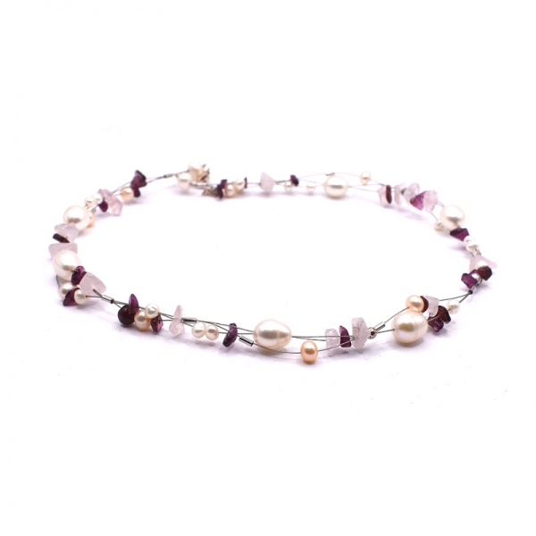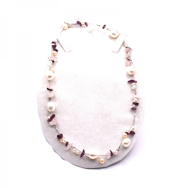 Κολιέ ασημένιο 925 με μαργαριτάρι με τσιπς ροζ και βυσσινι πέτρες σε λουστρέ φινίρισμα,είναι πέρασμενο σε ατσαλόσυρμα όπου είναι περασμένες οι πέτρες.Όμορφο κολιέ για να το φοράτε.Το μήκος του κολιέ είναι 45 cm.