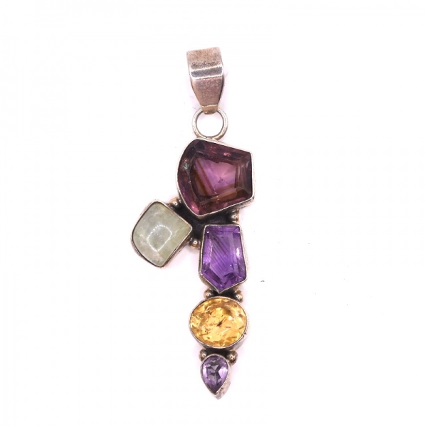 Μενταγιόν ασημένιο 925 χειροποίητο με διάφορες ορυκτές πέτρες δεμένες με καστόνι έχει λουστρέ φινίρισμα,οι πέτρες είναι σιτρίν,αμέθυστο και φεγγαρόπετρα.