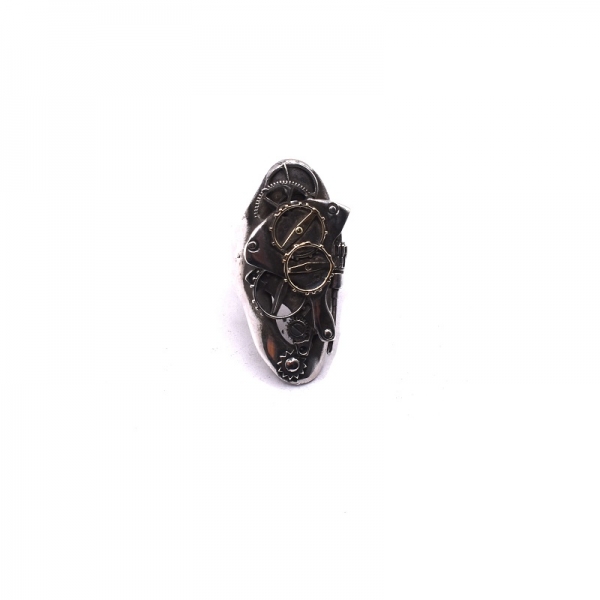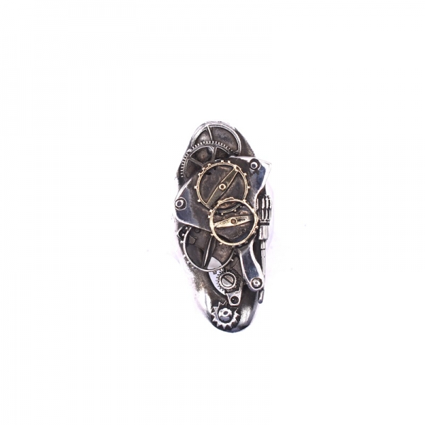 Δαχτυλίδι ασημένιο 925 και χρυσό Κ14 χειροποίητο αντικέ πάνω έχει μία μηχανή ρολογιού σε χρυσό με λουστρέ φινίρισμα.Το νούμερο του δαχτυλιδιού είναι το 51.Μπορείτε να το φοράτε κάθε μέρα.