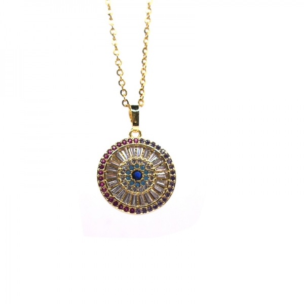 Κολιέ ατσάλινο σε χρυσό χρώμα στρογγυλό μοτίφ μάτι με πέτρες πολύχρωμες και λουστρέ φινίρισμα.Η αλησίδα έχει μήκος 41.5 cm και με την προέκταση φθάνει το 48 cm