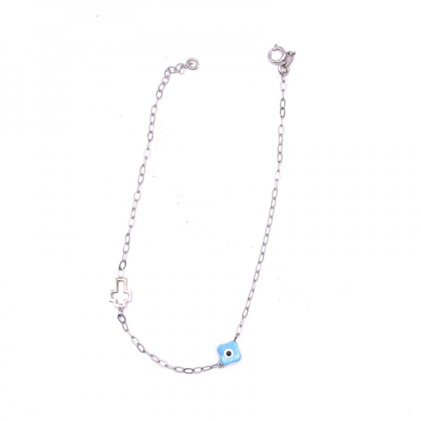 Βραχιόλι σε λευκόχρυσο Κ14 με μάτι φίλντισι και ένα μικρό σταυρό σε λουστέ φινίρισμα.Ένα όμορφο δώρο για το χέρι σας.