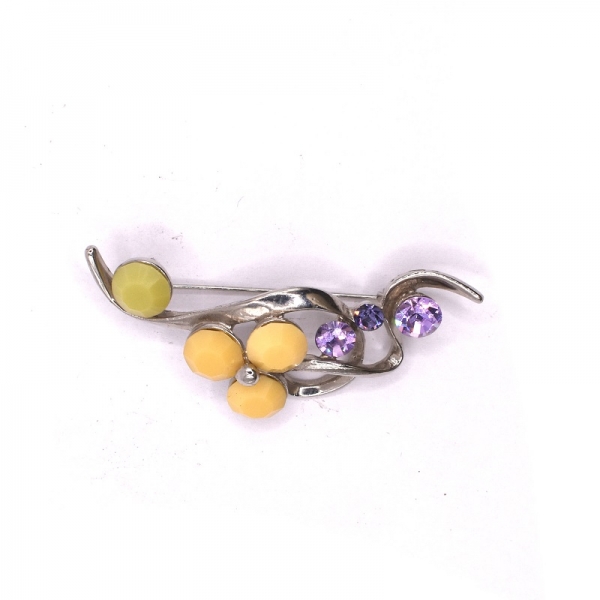 Καρφίτσα σε φω σε λευκό χρώμα έχει πάνω μωβ στρας και τρίς μέγαλες πέτρες σε μπέζ χρώμα.Όμορφη καρφίτσα για το πέτο του παλτού σας.Η διαστάση της καρφίτσας είναι: Υ:5.7 χ Π: 2.0