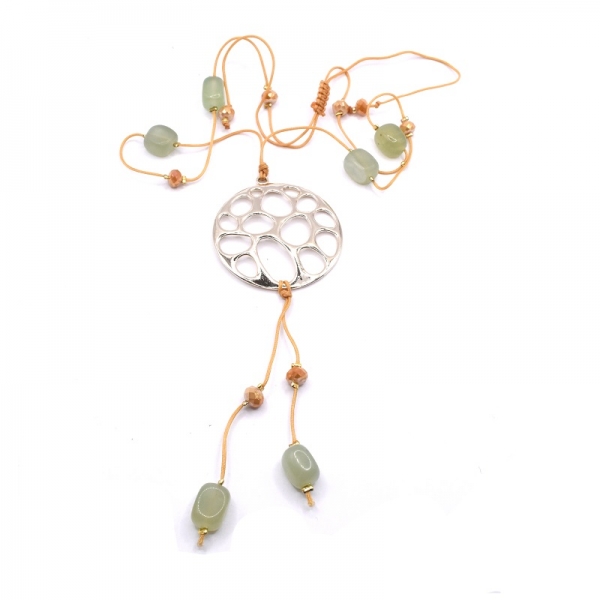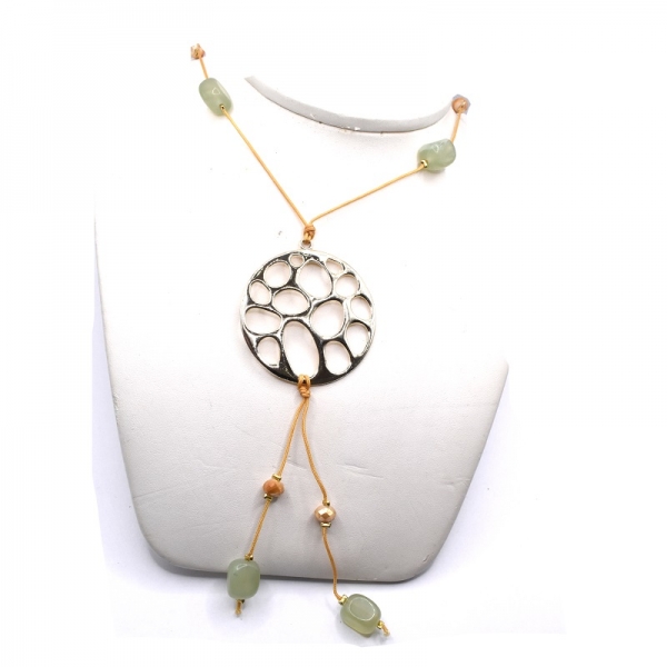 Κολιέ φω σε χρυσό χρώμα είναι περασμένο σε κορδόνι καφέ ανοιχτό και πάνω έχει αχάτη πέτρα και καφέ ανοιχτή πέτρα στην μέση έχει στρογγυλό μοτίφ.'Ομορφο δώρο για σας και για τους φίλους σας.