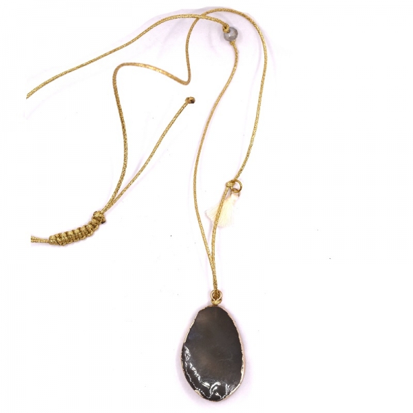 Κολιέ σε χρυσό χρώμα με πέτρα ρητίνη,το κορδόνι πάνω έχει μία πέτρα και μία μικρή φούντα μπεζ,στο τελείωμα είναι μάκραμε για να το προσαρμόσετε σε όποιο μήκος θέλετε.'Ομορφο δώρο για σας και για τους φίλους σας.