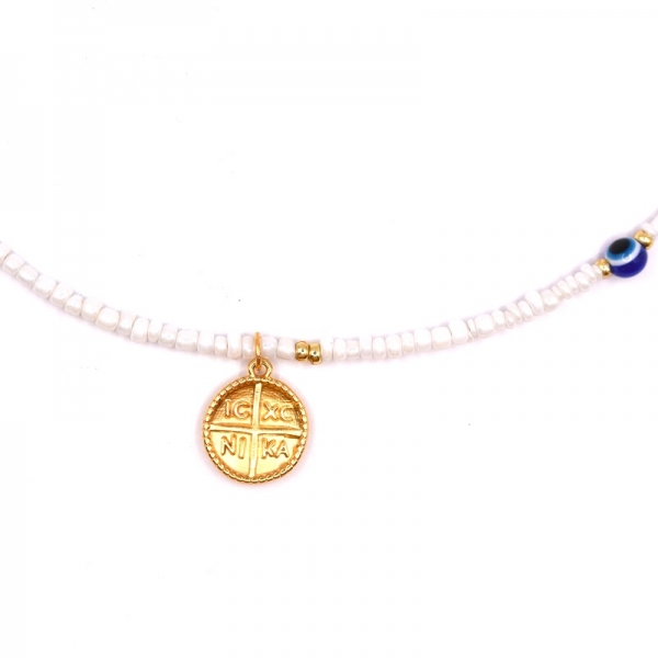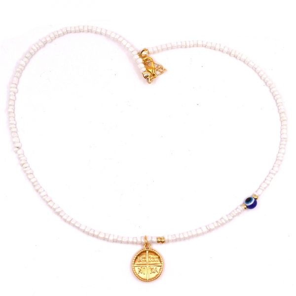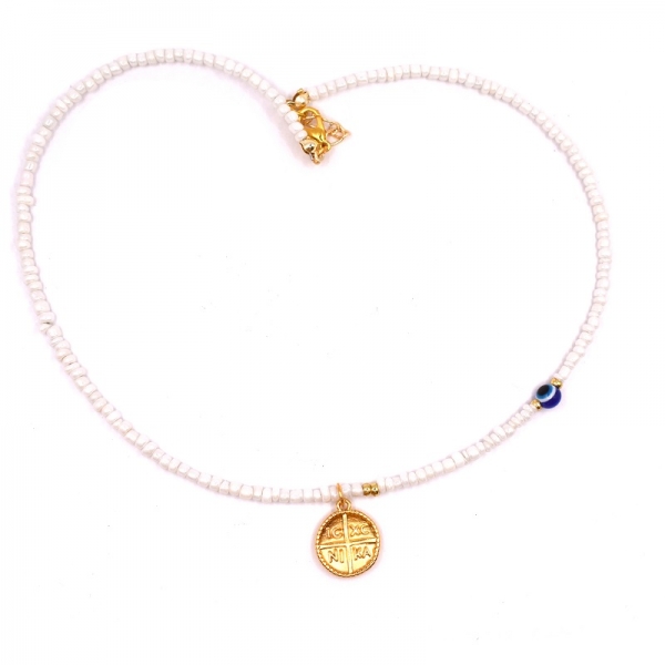 Κολιέ σε χρυσό χρώμα είναι περασμένες σε ατσαλόρσυρμα μικρές λευκές πέτρες και στην μέση έχει κωνσταντινάτο σε ατσάλι και ματάκι,στο τελείωμα έχει κούμπωμα και αλυσίδα.'Ομορφο δώρο για σας και για τους φίλους σας. |