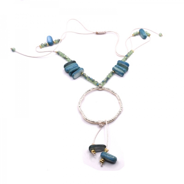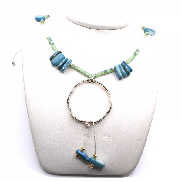 Κολιέ σε χρυσό χρώμα μακρύ,είναι περσμένο οι πέτρες σε κορδόνι και στην μέση έχει ένα στρογγυλό μοτίφ οι πέτρες είναι όστρακο και πράσινε πέτρες.'Ομορφο δώρο για σας και για τους φίλους σας.