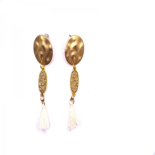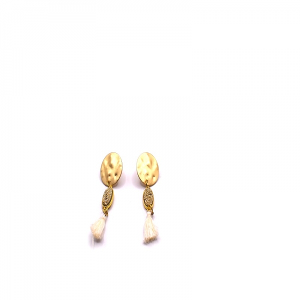 Σκουλαρίκια καρφωτό με ρητίνη και κρέμεται μια μπεζ φούντα επιχρυσωμένο .Όμορφο σκουλαρίκι που μπορείτε να τα φοράτε και να το συνδυάσετε σε κάθε εμφάνιση σας.