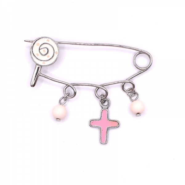 Υπέροχη παιδική παραμάνα σε ασήμι 925 για κοριτσάκι,έχει πάνω στην παραμάνα σπείρα με σμάλτο ροζ και άσπρο και κρέμεται δύο πέτρες και ένα σταυρό με ροζ σμαλτο σε λουστέ φινίρισμα.Μπορείτε να το κρεμάσετε στο κρεβατάκι του μωρού σας.