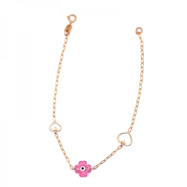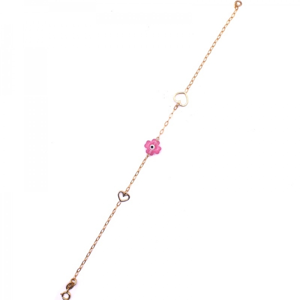 Βραχιόλι για κοριτσάκι παιδικό σε χρυσό Κ14 αλυσίδα που επάνω έχει μία ροζ πέτρα και δύο καρδιές σε λουστρέ φινίρισμα.Ένα όμορφο δώρο για την μικρή σας.