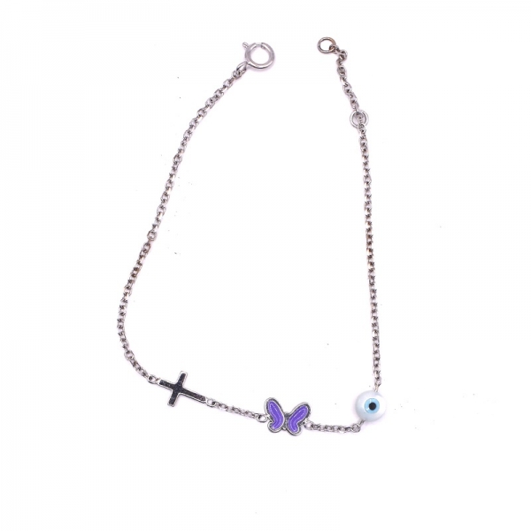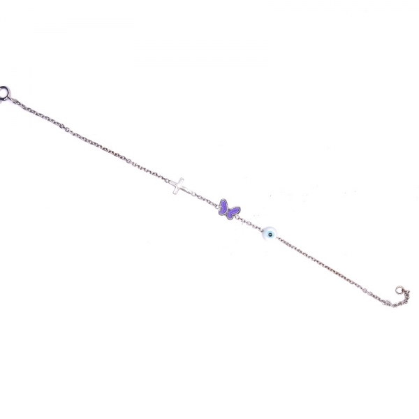 Βραχιόλι παιδικό σε λευκόχρυσο Κ14 με σμάλτο πάνω έχει μία πεταλούδα ματάκι και ένα μικρό σταυρό σε λουστέ φινίρισμα.Ένα όμορφο δώρο για τα παιδία σας.