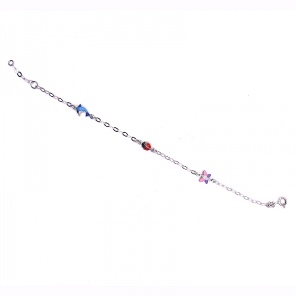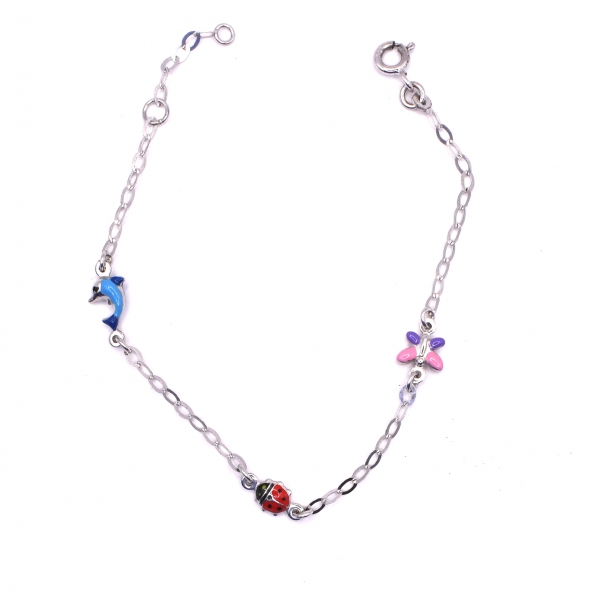Βραχιόλι παιδικό σε λευκόχρυσο Κ14 με σμάλτο πάνω έχει ένα δελφίνι μια πασχαλίτσα και μια πεταλούδα σε λουστέ φινίρισμα.Ένα όμορφο δώρο για τα παιδία σας.