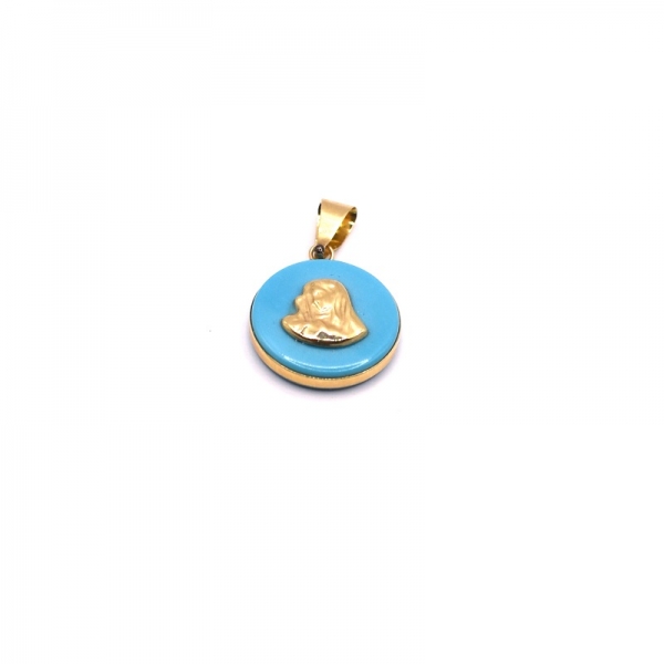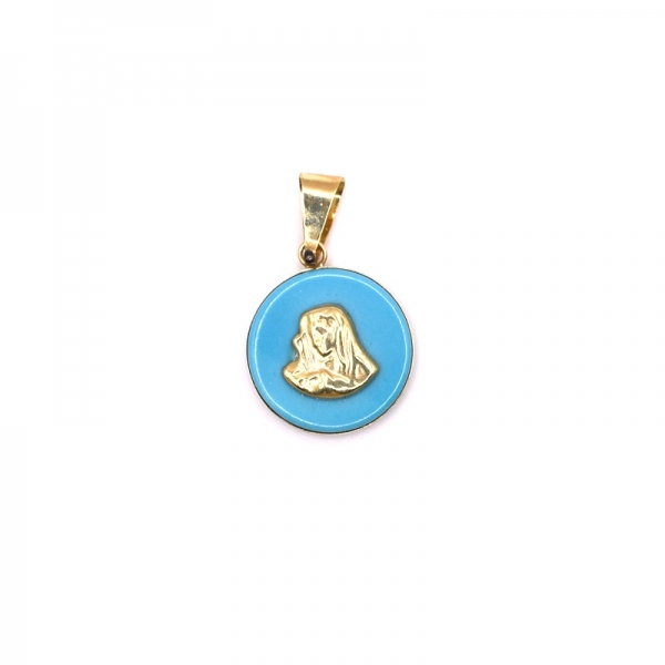 Παναγία στρογγυλή σε χρυσό Κ14 με τυρκουάζ.Όμορφο δώρο για να το κρεμάσετε στο μαξιλάρι του παιδιού σας.