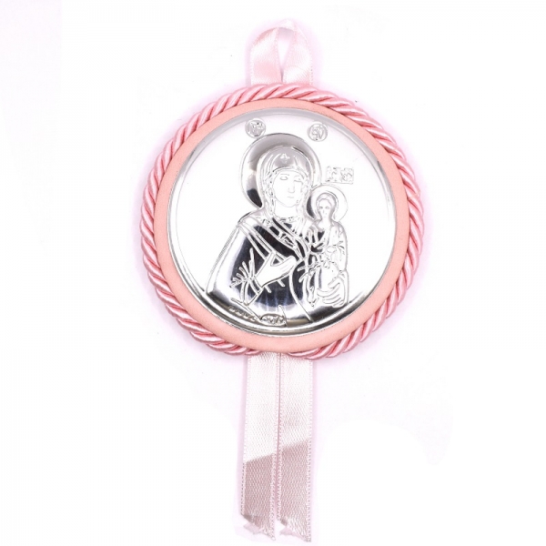 Εικονάκι κούνιας ασημένια σε ροζ για κοριτσάκι και σε σχήμα στρογγυλό έχει πάνω κρδώνι σε ροζ χρώμα και το πίσω μέρος είναι σε ροζ .'Ομορφη είκόνα για το κρεβατάκι του μωρού σας .Το εικονάκι η διάσταση είναι Υ: 9.5cm x Π: 9.5 cm |