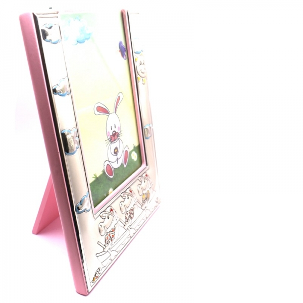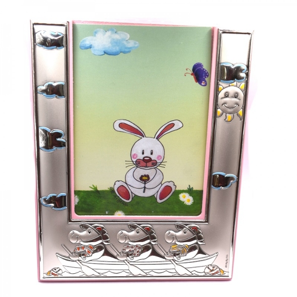 Κορνίζα ασημένια παιδική για κοριτσάκι σε χρώμα ροζ,είναι ματ και λουστρέ φινίρσμα πάνω στην κορίζα έχει ήλιο και συννεφάκια και τρία αλογάκια που κάνουν κουπί το πίσω μέρος της κορνίζας είναι με ξύλο ροζ.Η κορνίζα είναι Υ:18.0 cm x Π: 14.0 cm η διάσταση της φωτογραφίας είναι Π:9.0 cm x Υ:13.0 cm