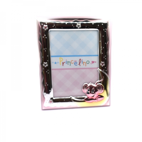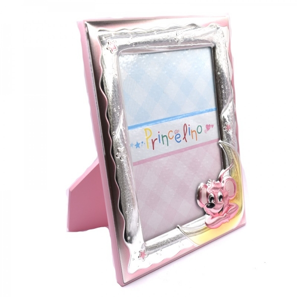 Κορνίζα ασημένια παιδική για κοριτσάκι σε χρώμα ροζ,είναι ματ και λουστρέ φινίρσμα πάνω στην κορίζα έχει ένα φεγγαράκι και κάθεται το ποντίκι το πίσω μέρος της κορνίζας είναι με ξύλο ροζ.Η κορνίζα είναι Υ:17.0 cm x Π: 13.5 cm η διάσταση της φωτογραφίας είναι Π:9.0 cm x Υ:13.0 cm