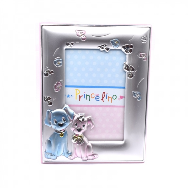 Κορνίζα ασημένια παιδική για κοριτσάκι σε χρώμα ροζ,είναι ματ και λουστρέ φινίρσμα πάνω στην κορίζα έχει δύο σκυλάκια το πίσω μέρος της κορνίζας είναι με ξύλο ροζ.Η κορνίζα είναι Υ:12.5 cm x Π: 10.0 cm η διάσταση της φωτογραφίας είναι Π:6.0 cm x Υ:9.0 cm