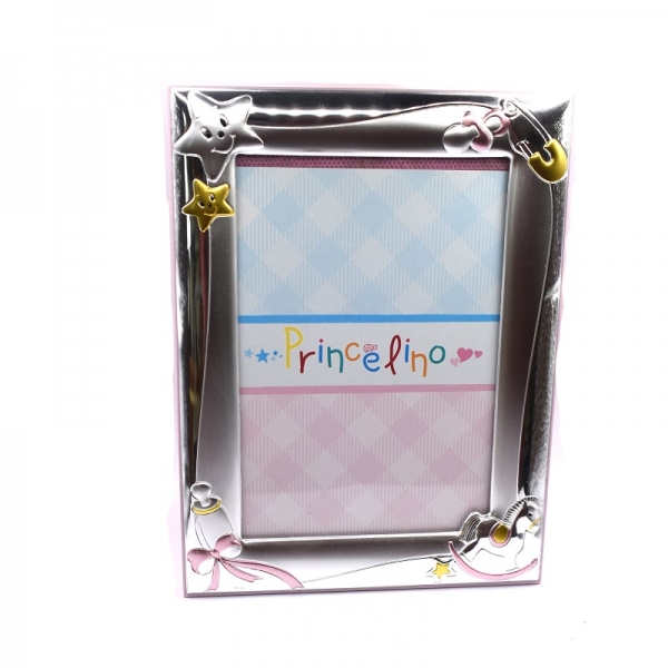 Children's silver photo frame for a little girl in pink color, it has a matte and glossy finish on the frame there is a horse, the back of the frame is made of pink wood. The frame is H: 17.0 cm x W: 13.0 cm the dimension of the photo is W: 9.0 cm x H:13.0 cm