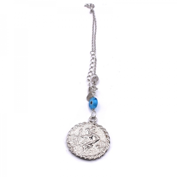 Silver amulet for the car, round, double-sided, on one side is the Virgin Mary and on the other is Saint Christopher. It is attached to a chain with a clasp and has an eye on it.