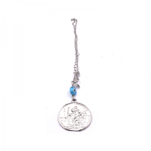 Silver amulet for the car, round, double-sided, on one side is the Virgin Mary and on the other is Saint Christopher. It is attached to a chain with a clasp and has an eye on it.