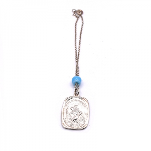 Double sided silver charm for the car with the Virgin Mary on one side and Saint Christopher on the other. It is attached to a chain with a clasp and has an eye on it.