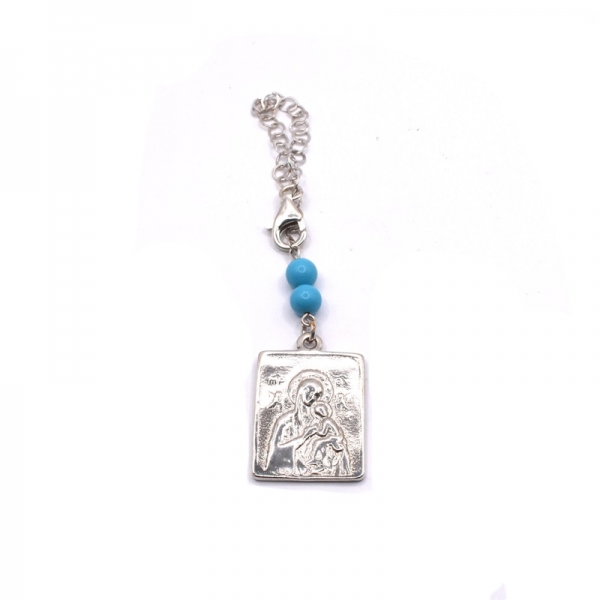 Double-sided silver car amulet has the Virgin Mary on both sides. It is attached to a chain with a clasp and has two turquoise beads on it.