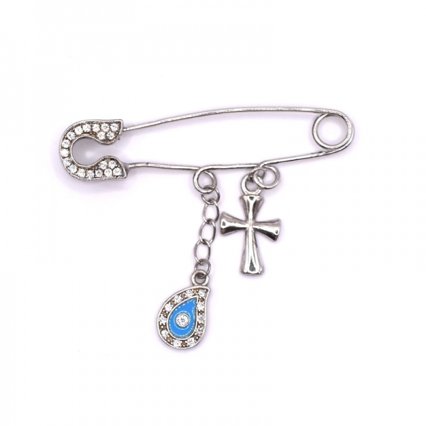Wonderful baby nanny in 925 silver with zircon, hangs an eye with enamel and zircon and a small cross on one side has light blue enamel and on the other plain in a polished finish. You can hang it on your baby's crib.