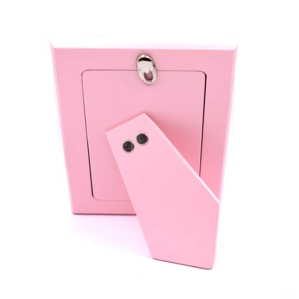 Children's silver frame for a little girl in pink color, it has a matte and glossy finish on the frame, it has two children in a boat, the back of the frame is made of pink wood. The frame is H: 12.5 cm x W: 10.0 cm, its dimensions photo is W:6.0 cm x H:9.0 cm