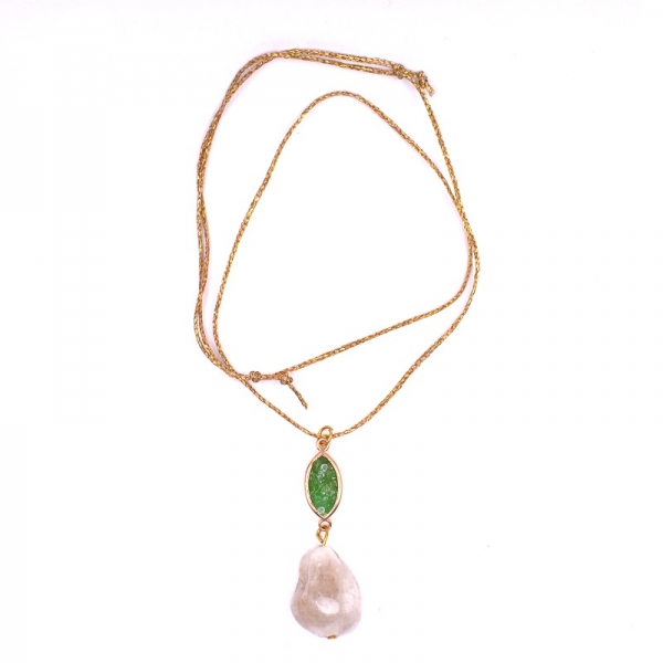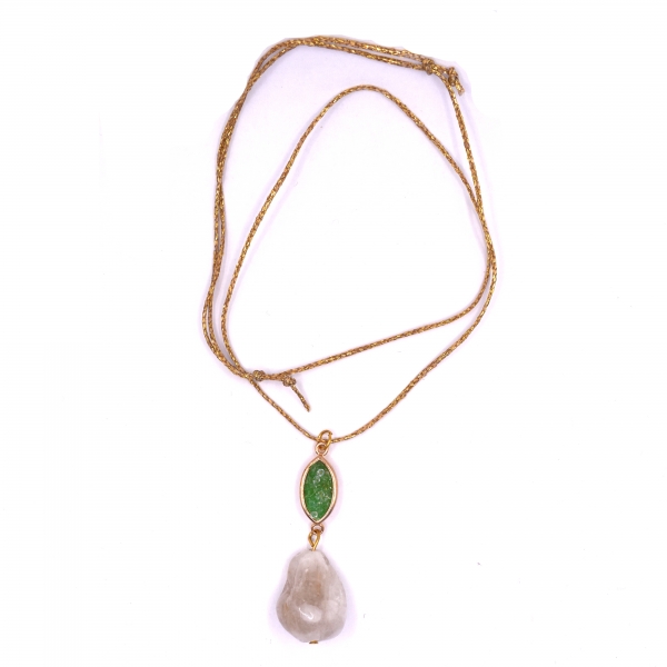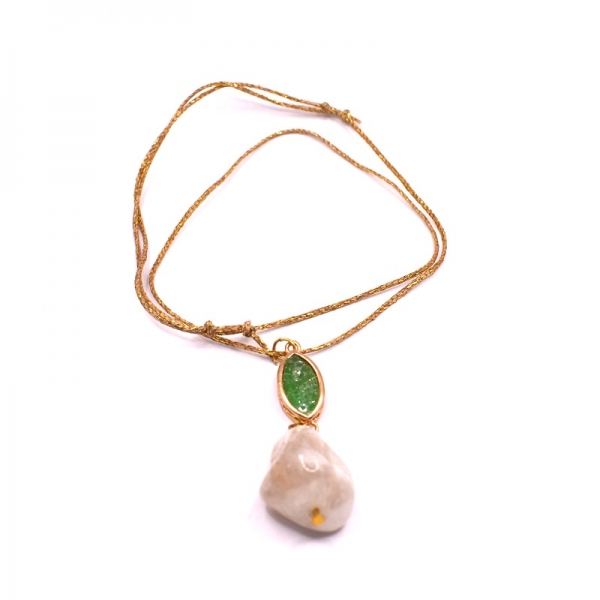 Κολιέ σε χρυσό χρώμα,έχει σε σχήμα δάκρυ πράσινη ρητίνη και από κάτω ορυκτή πέτρα,περασμένο σε χρυσό κορδόνι.'Ομορφο δώρο για σας και για τους φίλους σας.