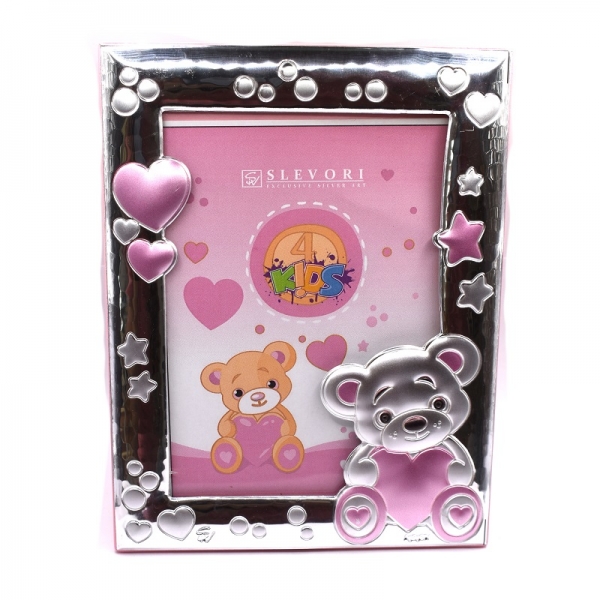Κορνίζα ασημένια παιδική για κοριτσάκι σε χρώμα ροζ,είναι ματ και λουστρέ φινίρσμα πάνω στην κορίζα έχει ένα αρκουδάκι που κρατάει μια καρδιά το πίσω μέρος της κορνίζας είναι με ξύλο ροζ.Η κορνίζα είναι Υ:17.0 cm x Π: 13.0 cm η διάσταση της φωτογραφίας είναι Π:9.0 cm x Υ:13.0 cm